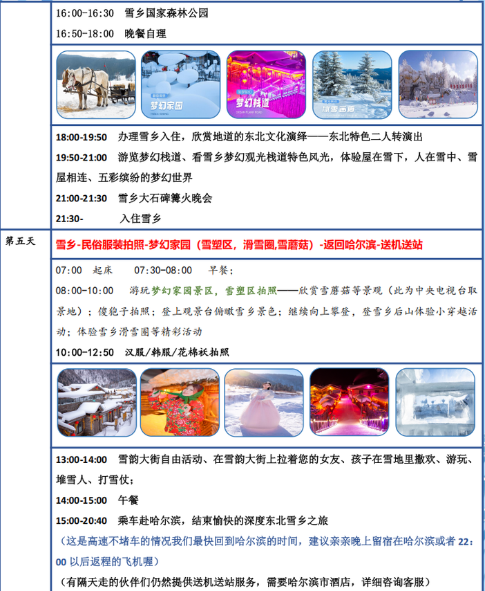 第五天:雪乡-民俗服装拍照-梦幻家园(雪塑区,滑雪圈,雪蘑菇)-返回哈尔滨-送机送站