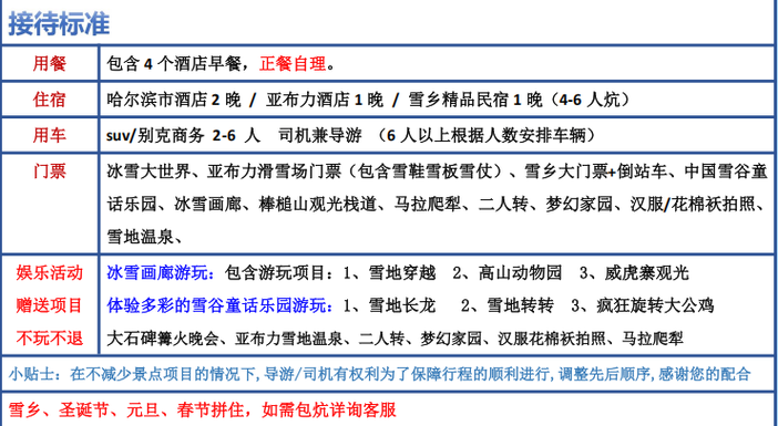【接待标准】儿童价格指的是身高在1.19米以下儿童,1.2米(含1.2米)以上儿童同成人价格,有雪乡门票减免证件的游客请在行程开始时出示证件,在旅行结束原路退回差价!