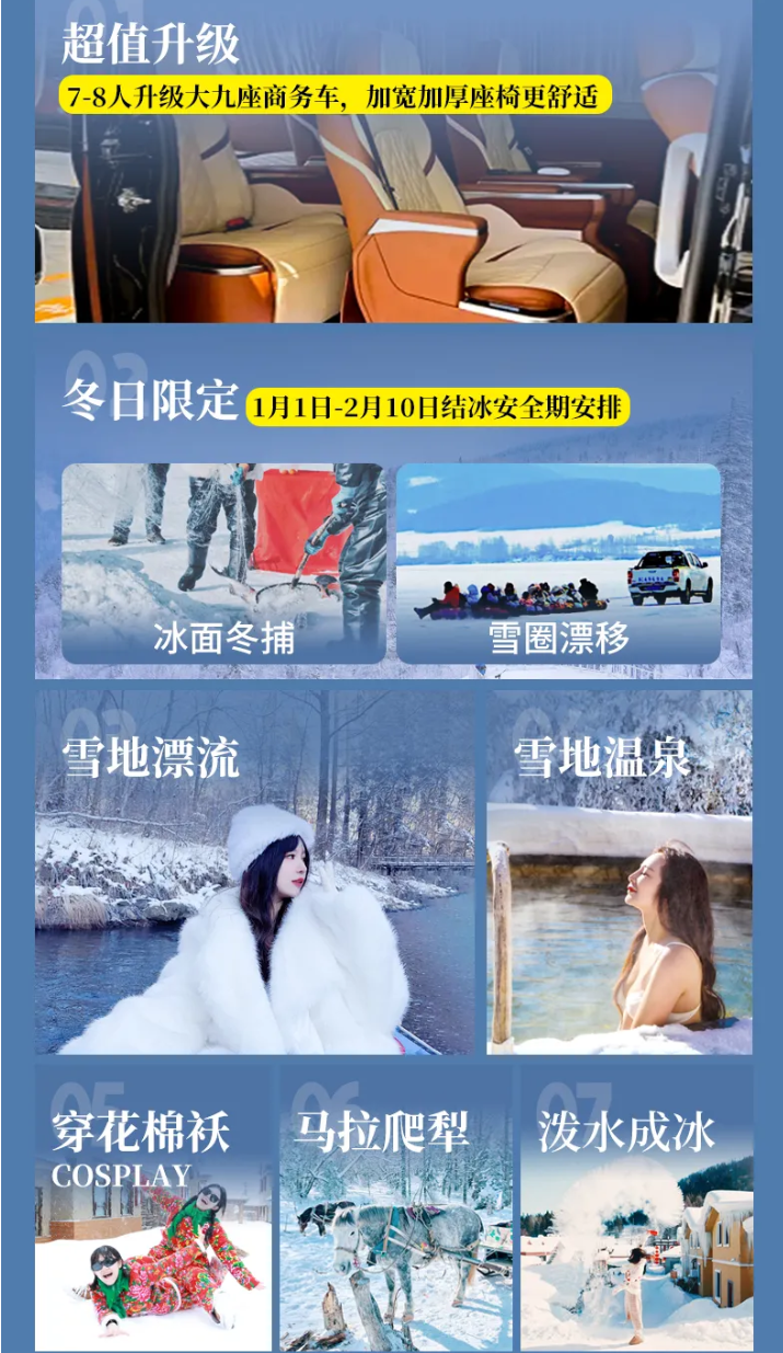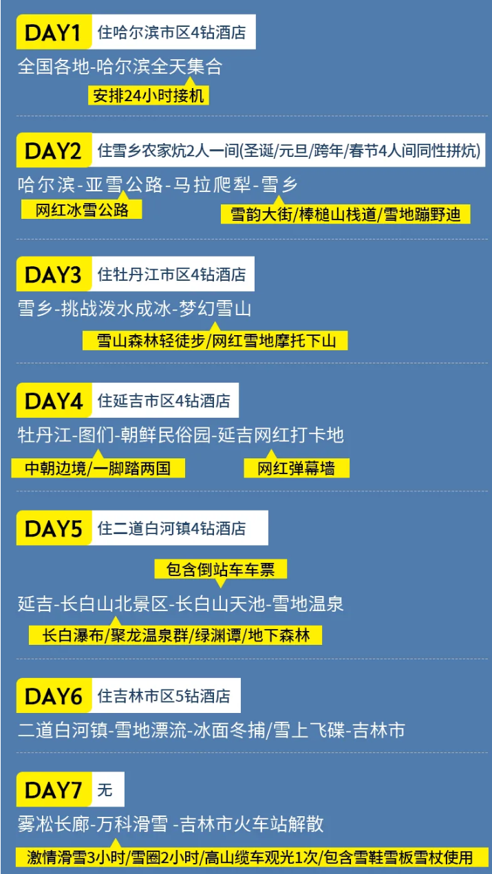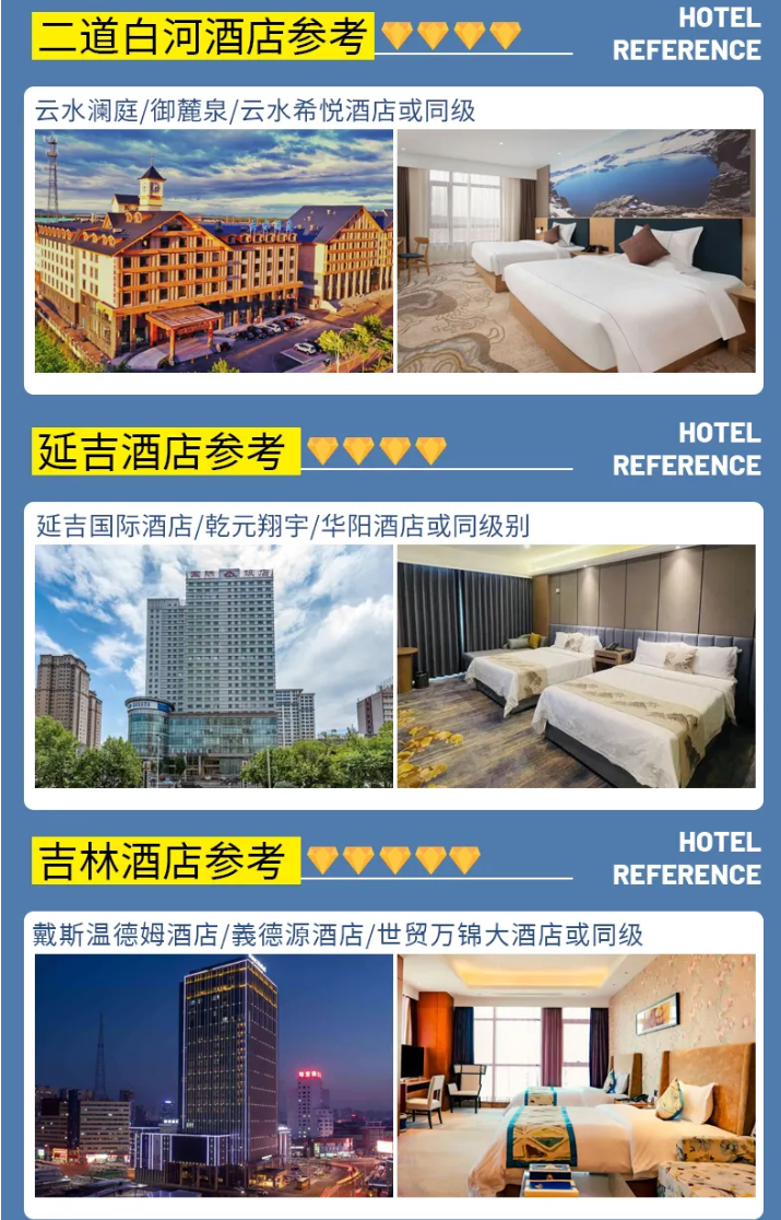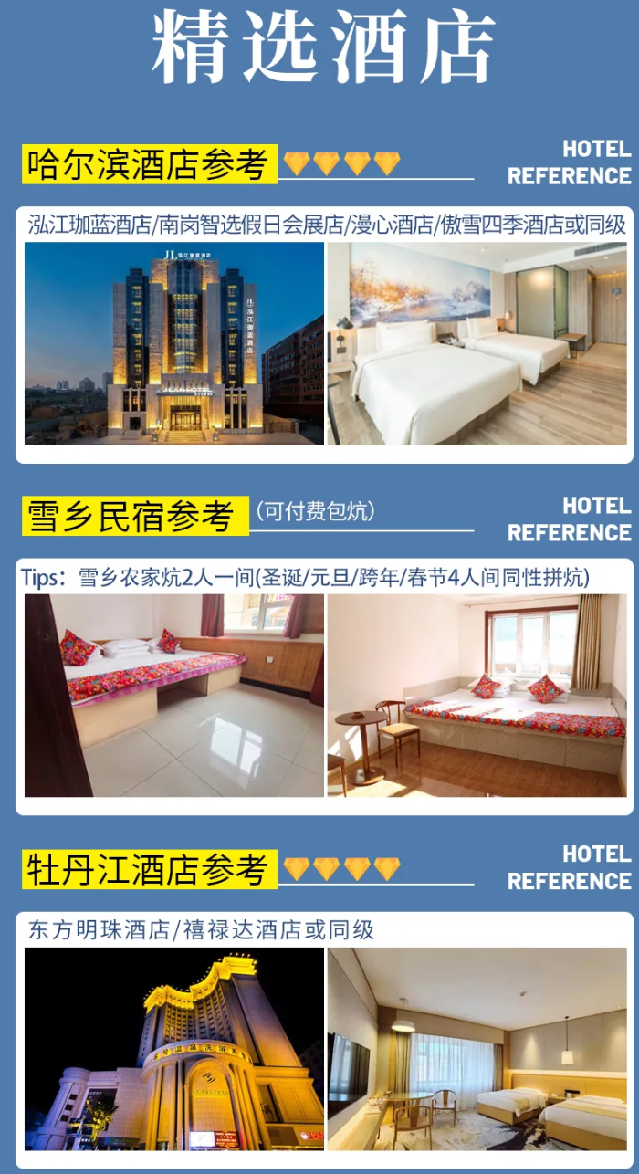 1.2米以下为儿童,含车位费、雪乡炕位、滑雪、赠送项目、保险、免门票、免早餐,不含酒店住宿、不含雪地漂流,不含温泉正常1.2米以下免票如遇收费自理;超高但未满12周岁需补门票440元+温泉100元/次+早餐费190元;如需占床需补床位费5晚酒店1400元/人含早餐含温泉,1晚农家炕如想单住请现询客服。 私家团费用说明: · 2人起天天发团,司机兼管家,如逢单数报名产生空床位需补单房差 · 雪乡2人一间炕(包括圣诞/跨年/元旦/春节团期) · 包含解散日或隔天统一送机 · 2-3客人用5座SUV,4-5客人用7座商务车,6客人用9座商务车,7-8客人用大九座商务车,9-12客人用15-18座旅行巴士,保证百分之二十空座率。(如用15座及以上车型每日行程时间会比小型商务车增加1-3小时不等,望您悉知。) 优惠团期补900元/人(包含雪乡炕位升级),如产生空床位需要补单房差1950元(750+300+900) 升级参考酒店如下: 哈尔滨市:参考施柏阁酒店或皇冠假日或新巴黎酒店或同级5钻酒店 雪乡:参考雪筑遇见/纳山纳雪/雪韵假日/万嘉森林或同级别4钻轻奢民宿 牡丹江市:参考夏威夷/世贸假日或同级5钻酒店 二道白河镇参考:王朝圣地酒店或同级5钻酒店 延吉市参考:卡伊洛斯或红菊大厦或同级5钻酒店 吉林市:与散拼团同为5钻酒店标准,补差价不含这一晚费用 | ||||