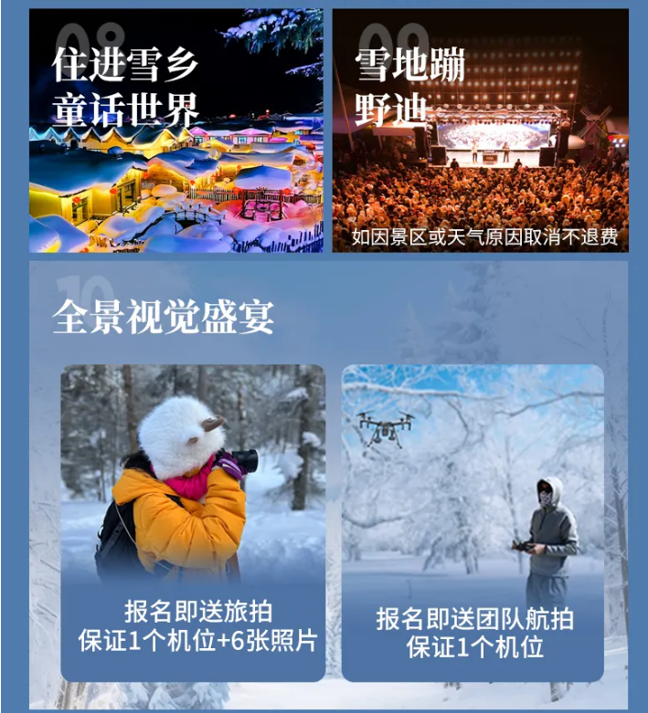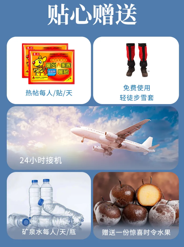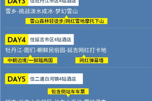 1.2米以下为儿童,含车位费、雪乡炕位、滑雪、赠送项目、保险、免门票、免早餐,不含酒店住宿、不含雪地漂流,不含温泉正常1.2米以下免票如遇收费自理;超高但未满12周岁需补门票440元+温泉100元/次+早餐费190元;如需占床需补床位费5晚酒店1000元/人含早餐含温泉、1晚农家炕600元/人含早餐 | ||||