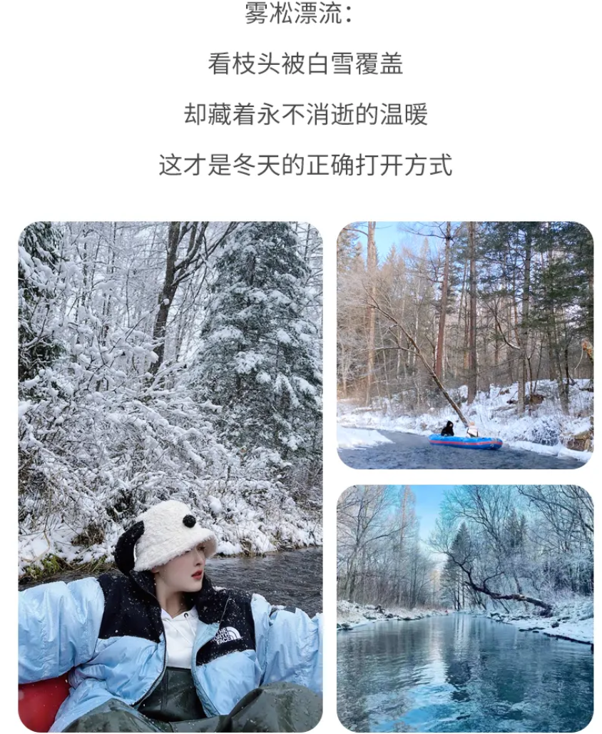 06:30  抵达【雪地漂流】,当气温达到零下二三十度时,万物都被白雪冰凌覆盖,而航线上只有一条温泉河流静静流淌。漂流在雪林之中,看着两岸雾凇树挂(视天气情况),一派“船在水上漂,人在林中游”的意境。