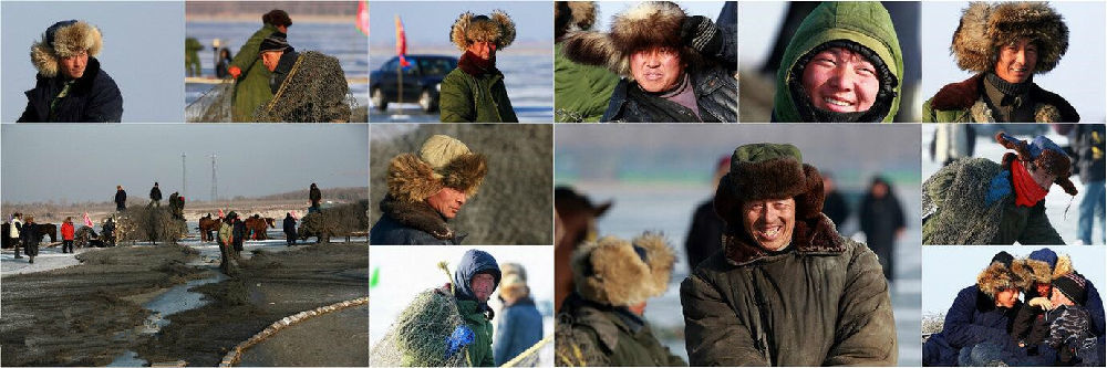 看查干湖冬捕,最为耀眼的还是查干湖的渔夫,个个头戴说不上是什么毛的帽子。有的身穿羊皮坎肩,有的脸上扣着一把撸,脚穿棉雨靴。他们的装束打扮都有着很浓郁的地方风情。渔夫们都有着自己的分工,有扬鞭赶着马拉着绞磨转的,有清理渔网的,有把拉上的渔网叠起来码放好,有在冰窟窿前用平铁锨撩水的,有捡鱼分类的,有用秤称鱼的。每个人都在自己的岗位上,尽职尽责的工作,像流水线一样,谁要想脱岗都难。