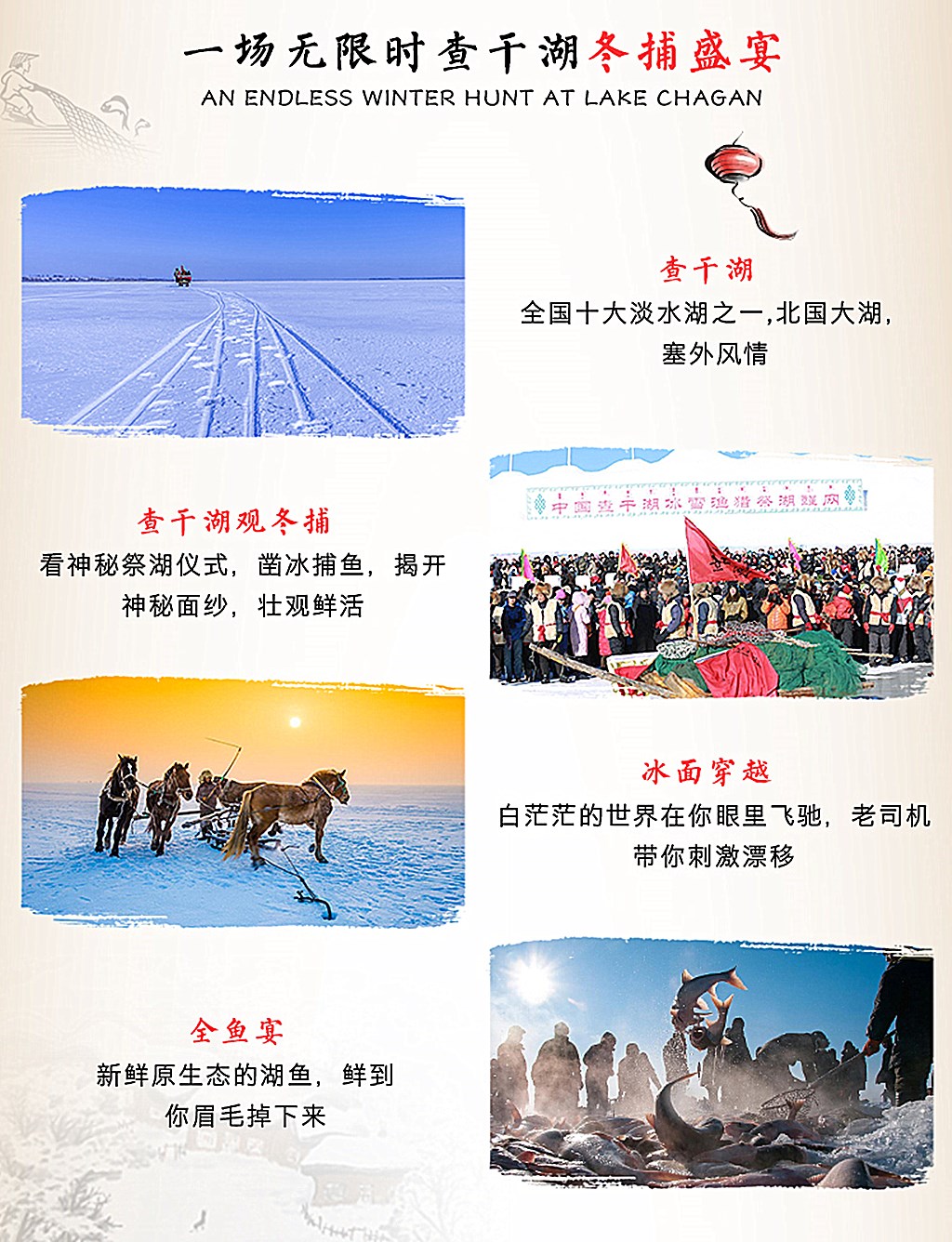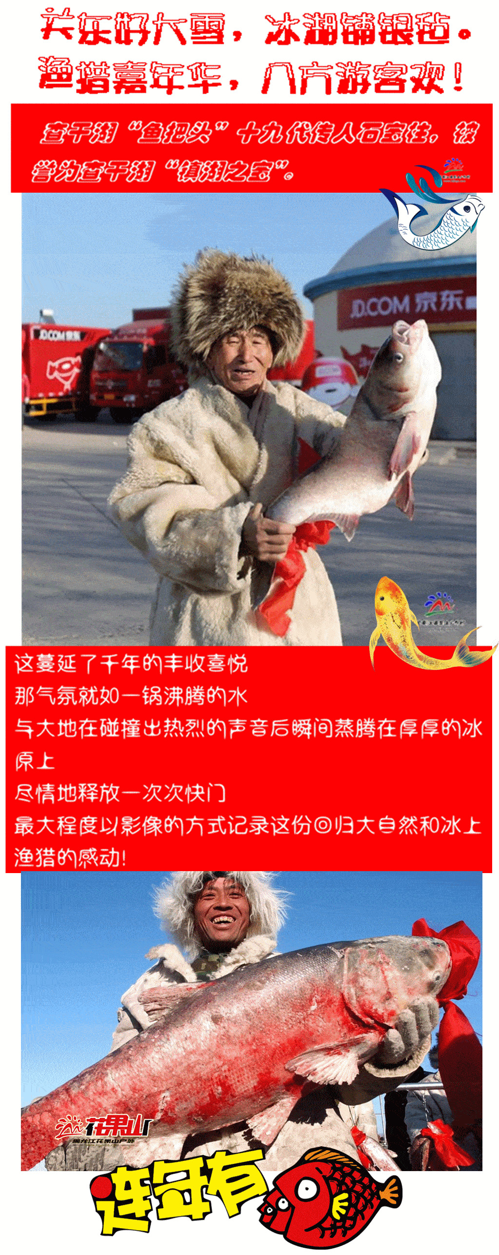 ✦【活动主题】:◆查干湖冬捕奇观【第24届冬捕盛典】◆冰湖腾鱼◆年年有鱼◆品中华第一美味-查干湖全鱼宴◆吉祥塔祈福◆新的一年福气多多/财运亨通◆南湖休闲美拍◆单日活动召集