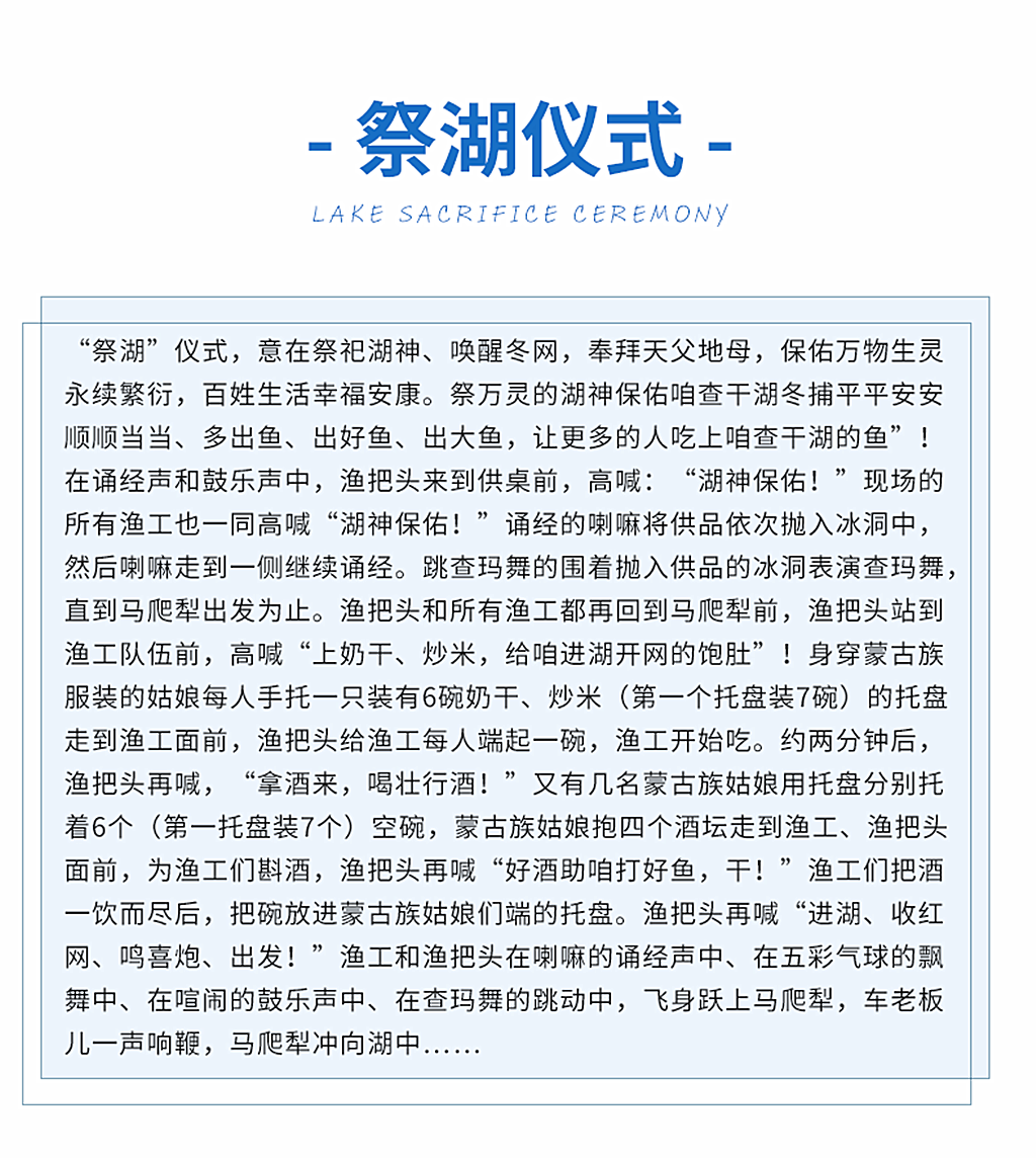 查干湖是目前中国北方唯一一个依然保持着用传统的捕捞方式进行冬捕作业的原始捕鱼部落。查干湖冬捕早在辽金时期就享有盛名。虽然岁月更迭,但查干湖的紫光灵气犹存,查干湖冬捕的神奇、神秘与神圣依旧。每年冬捕前都要举行传统的祭湖醒网仪式,意在祭祀湖神、唤醒冬网,奉拜天父地母,保佑万物生灵永续繁衍,百姓生活幸福安康。